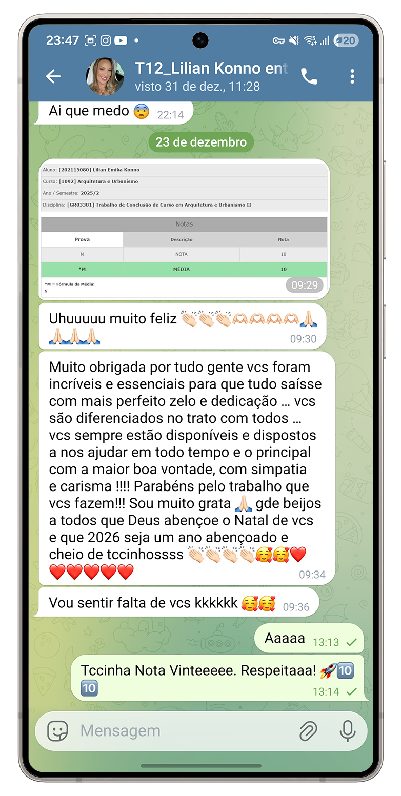 Depois, se você quiser construir uma relação de longo prazo comigo, tendo um acompanhamento diário e individual, vou te dar essa oportunidade. Mas eu quero que você receba o melhor nesse primeiro momento, e que depois você se sinta livre e à vontade para entrar na Mentoria TCC Nota 10 se realmente desejar.
