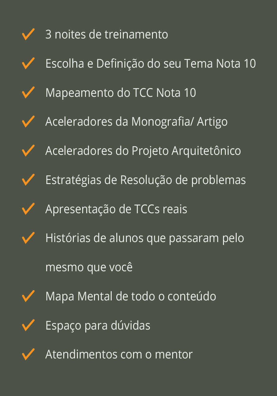 Uma semana de encontros ao vivo para você aplicar a metodologia que mais gera TCCs Nota 10 de arquitetura e urbanismo do Brasil.